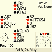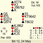| Con | Dc | Res | Score | Ld | Pairs | Rd | Tbl | | 2 NT | W | -3 | 150 | T | 06 - 03 | 4 | 6 |