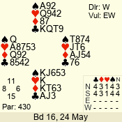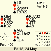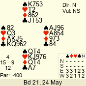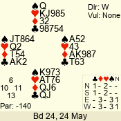 | Con | Dc | Res | Score | Ld | Pairs | Rd | Tbl | | 4 NT | W | -1 | 50 | 2 | 02 - 03 | 7 | 2 |