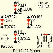 | Con | Dc | Res | Score | Ld | Pairs | Rd | Tbl | | 3 NT | S | = | 600 | 2 | 03 - 05 | 8 | 3 |
