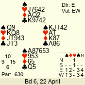| 3 NT | E | +1 | -630 | 3 | 01 - 04 | 4 | 1 |