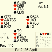 | Con | Dc | Res | Score | Ld | Pairs | Rd | Tbl | | 2 NT | N | = | 120 | 5 | 05 - 06 | 6 | 5 |