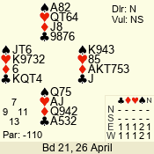 | Con | Dc | Res | Score | Ld | Pairs | Rd | Tbl | | 3 NT | N | +1 | 630 | A | 04 - 05 | 6 | 4 |