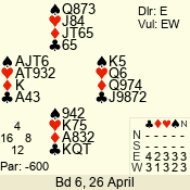 | Con | Dc | Res | Score | Ld | Pairs | Rd | Tbl | | 2 NT | W | -2 | 100 | 6 | 06 - 01 | 6 | 6 |