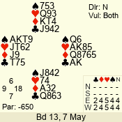 | Con | Dc | Res | Score | Ld | Pairs | Rd | Tbl | | 7 NT | W | -1 | 50 | 5 | 04 - 09 | 6 | 4 |