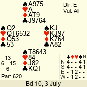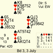 | 3 NT | S | +1 | 430 | 8 | 08 - 10 | 17 | 8 |