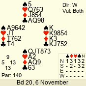 | 3 NT | W | +1 | -630 | 2 | 01 - 08 | 10 | 1 |