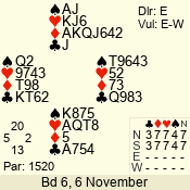 | Con | Dc | Res | Score | Ld | Pairs | Rd | Tbl | | 7 NT | N | = | 1520 | 4 | 04 - 08 | 11 | 6 |