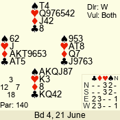 | Con | Dc | Res | Score | Ld | Pairs | Rd | Tbl | | 3 NT | W | -2 | 200 | 4 | 14 - 12 | 12 | 4 |