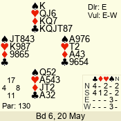 | Con | Dc | Res | Score | Ld | Pairs | Rd | Tbl | | 6 NT | E | -3 | 150 | 7 | 09 - 05 | 5 | 9 |