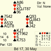 | Con | Dc | Res | Score | Ld | Pairs | Rd | Tbl | | 2 NT | N | = | 120 | T | 06 - 04 | 3 | 6 |