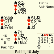 | Con | Dc | Res | Score | Ld | Pairs | Rd | Tbl | | 3 NT | S | = | 400 | A | 05 - 11 | 7 | 5 |
