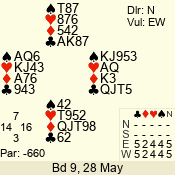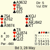 | 3 NT | W | +2 | -660 | 2 | 02 - 05 | 4 | 2 |