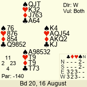 | Con | Dc | Res | Score | Ld | Pairs | Rd | Tbl | | 3 NT | W | -1 | 50 | 9 | 04 - 08 | 6 | 4 |