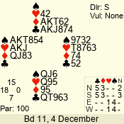 | Con | Dc | Res | Score | Ld | Pairs | Rd | Tbl | | 3 NT | W | -1 | 50 | 4 | 11 - 11 | 1 | 11 |