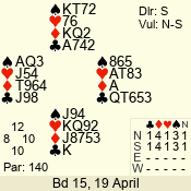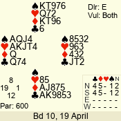 | Con | Dc | Res | Score | Ld | Pairs | Rd | Tbl | | 3 NT | S | = | 600 | 3 | 06 - 03 | 4 | 6 |