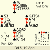 | Con | Dc | Res | Score | Ld | Pairs | Rd | Tbl | | 3 NT | N | +1 | 430 | J | 07 - 01 | 7 | 7 |