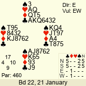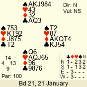 | Con | Dc | Res | Score | Ld | Pairs | Rd | Tbl | | 3 NT | N | +2 | 460 | 7 | 10 - 04 | 2 | 4 |