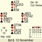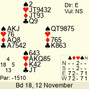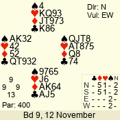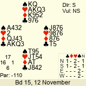 | 2 NT | S | +1 | 150 | Q | 11 - 03 | 8 | 3 |
