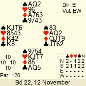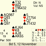 | 3 NT | W | +1 | -630 | 3 | 12 - 06 | 5 | 4 |