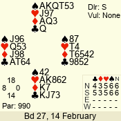 | Con | Dc | Res | Score | Ld | Pairs | Rd | Tbl | | 6 NT | S | = | 990 | 4 | 02 - 04 | 8 | 2 |