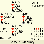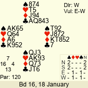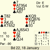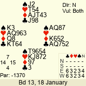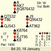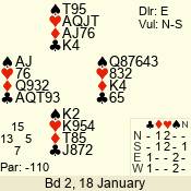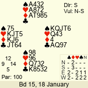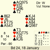 | Con | Dc | Res | Score | Ld | Pairs | Rd | Tbl | | 2 NT | W | -2 | 200 | 3 | 04 - 05 | 1 | 3 |