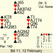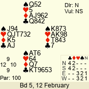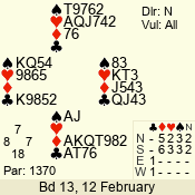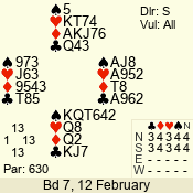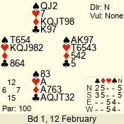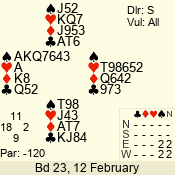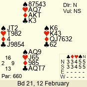 | Con | Dc | Res | Score | Ld | Pairs | Rd | Tbl | | 5 NT | S | = | 660 | 4 | 05 - 05 | 1 | 5 |