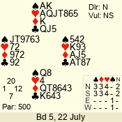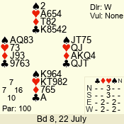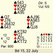 | Con | Dc | Res | Score | Ld | Pairs | Rd | Tbl | | 3 NT | S | = | 600 | 3 | 06 - 08 | 7 | 6 |