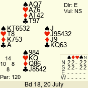 | Con | Dc | Res | Score | Ld | Pairs | Rd | Tbl | | 2 NT | S | +2 | 180 | 3 | 07 - 08 | 2 | 5 |