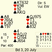 | Con | Dc | Res | Score | Ld | Pairs | Rd | Tbl | | 3 NT | S | = | 400 | 7 | 09 - 01 | 1 | 1 |