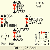 Con | Dc | Res | Score | Ld | Pairs | Rd | Tbl | 3 NT | S | +3 | 490 | | 02 - 11 | 11 | 2 |
