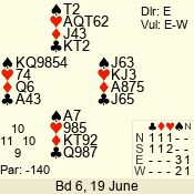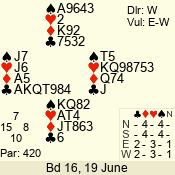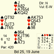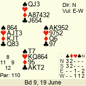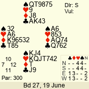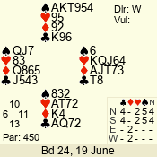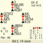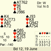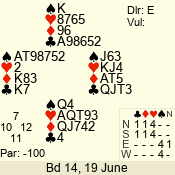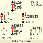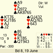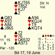 Con | Dc | Res | Score | Ld | Pairs | Rd | Tbl | 3 NT | E | -3 | 300 | J | 01 - 04 | 7 | 1 |
