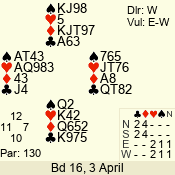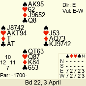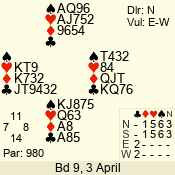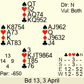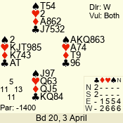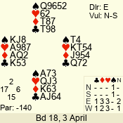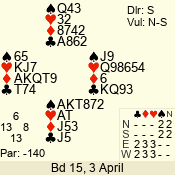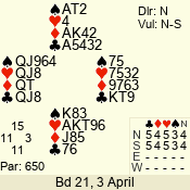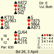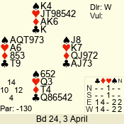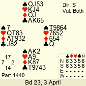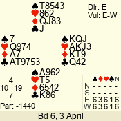 Con | Dc | Res | Score | Ld | Pairs | Rd | Tbl | 3 NT | S | +3 | 690 | 3 | 06 - 04 | 3 | 6 |