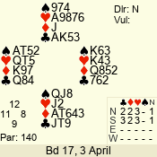 Con | Dc | Res | Score | Ld | Pairs | Rd | Tbl | 3 NT | S | = | 400 | 2 | 03 - 03 | 1 | 3 |