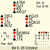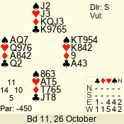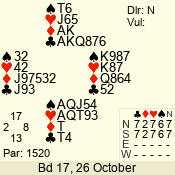 Con | Dc | Res | Score | Ld | Pairs | Rd | Tbl | 3 NT | N | +4 | 520 | 4 | 10 - 10 | 11 | 10 |