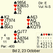 Con | Dc | Res | Score | Ld | Pairs | Rd | Tbl | 2 NT | E | -4 | 400 | 2 | 03 - 04 | 9 | 3 |