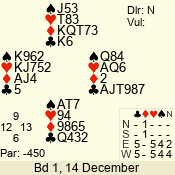 Con | Dc | Res | Score | Ld | Pairs | Rd | Tbl | 3 NT | N | +1 | 430 | 6 | 03 - 01 | 3 | 3 |