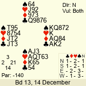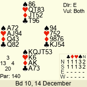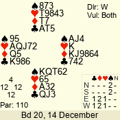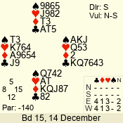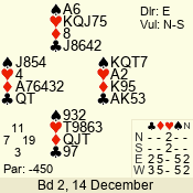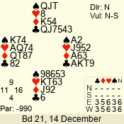 Con | Dc | Res | Score | Ld | Pairs | Rd | Tbl | 2 NT | E | = | -120 | 5 | 04 - 03 | 2 | 4 |