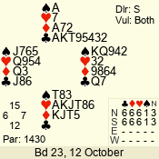 Con | Dc | Res | Score | Ld | Pairs | Rd | Tbl | 3 NT | S | +1 | 430 | 3 | 06 - 03 | 19 | 6 |