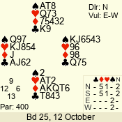 Con | Dc | Res | Score | Ld | Pairs | Rd | Tbl | 2 NT | W | -4 | 400 | J | 10 - 07 | 19 | 10 |