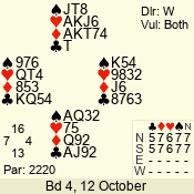 Con | Dc | Res | Score | Ld | Pairs | Rd | Tbl | 3 NT | N | +4 | 720 | 4 | 10 - 06 | 20 | 10 |