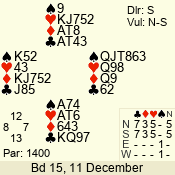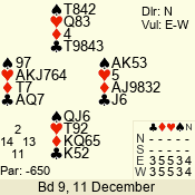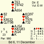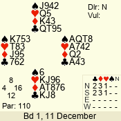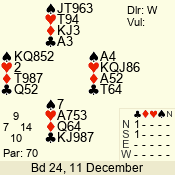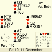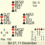 Con | Dc | Res | Score | Ld | Pairs | Rd | Tbl | 3 NT | S | +1 | 630 | 8 | 11 - 05 | 7 | 11 |