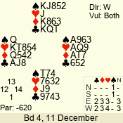 Con | Dc | Res | Score | Ld | Pairs | Rd | Tbl | 4  | S | = | 620 | 6 | 04 - 09 | 10 | 4 |