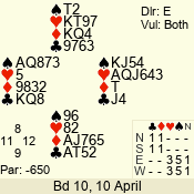 Con | Dc | Res | Score | Ld | Pairs | Rd | Tbl | 4  | S | +1 | 650 | 6 | 05 - 07 | 13 | 5 |