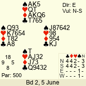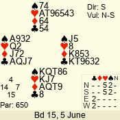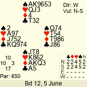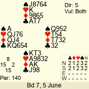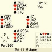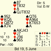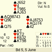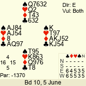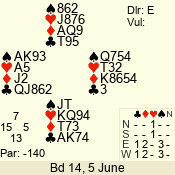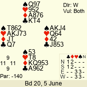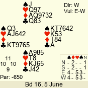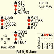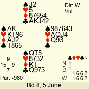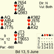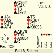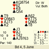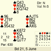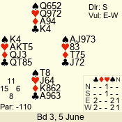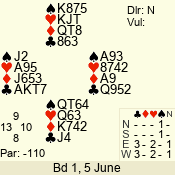 | 3 NT | W | +1 | -630 | 3 | 01 - 05 | 4 | 1 |