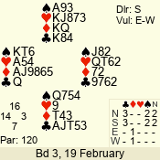 Con | Dc | Res | Score | Ld | Pairs | Rd | Tbl | 2 NT | N | = | 120 | 2 | 02 - 02 | 1 | 2 |