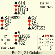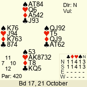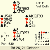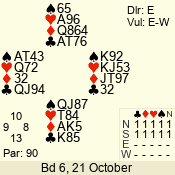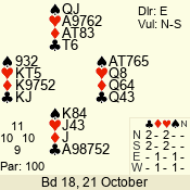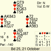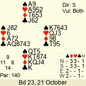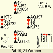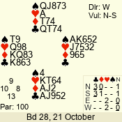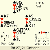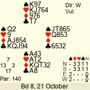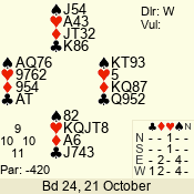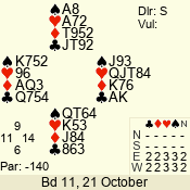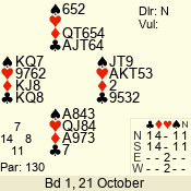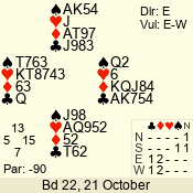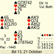 Con | Dc | Res | Score | Ld | Pairs | Rd | Tbl | 2 NT | W | -4 | 200 | 4 | 13 - 13 | 1 | 13 |