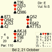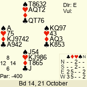 Con | Dc | Res | Score | Ld | Pairs | Rd | Tbl | 3 NT | E | -1 | 100 | Q | 14 - 02 | 13 | 14 |