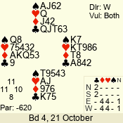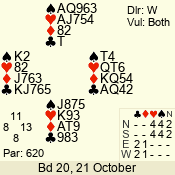 Con | Dc | Res | Score | Ld | Pairs | Rd | Tbl | 4  | E | = | -620 | A | 13 - 14 | 14 | 13 |