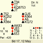 | Con | Dc | Res | Score | Ld | Pairs | Rd | Tbl | | 3 N | W | = | -600 | T | 09 - 12 | 17 | 9 |