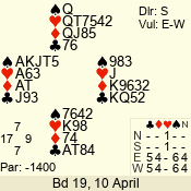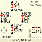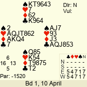 Con | Dc | Res | Score | Ld | Pairs | Rd | Tbl | 3 NT | S | +1 | 630 | 5 | 10 - 04 | 2 | 4 |